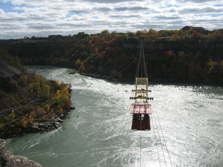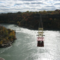 - en-CA Spanish Aero car crossing above the Whirlpool Rapids. Fall colours on trees in the background. Photo taken from Thompson's Point.