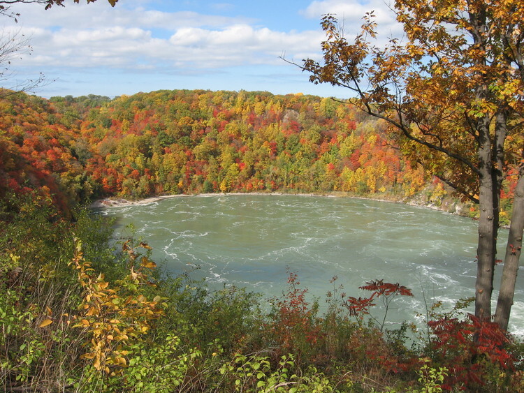 en-CA Fall colours at the whirlpool rapids taken from the sidewalk at the Spanish Aero Car building.