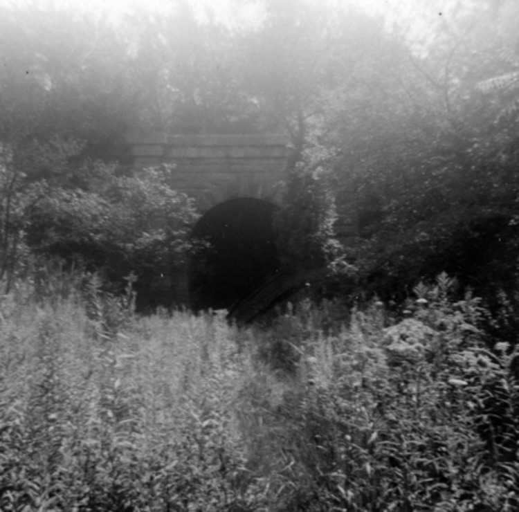 - en-CA The Grand Trunk Railway Tunnel Under the third Welland Canal surrounded by overgrown vegetation.