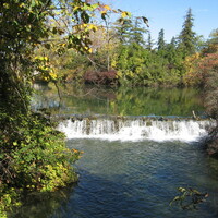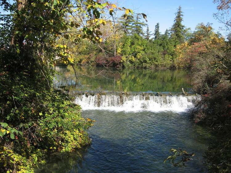 - en-CA Fall colours on the trees by the small waterfall at Dufferin Islands.