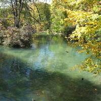 - en-CA Fall colours on the trees at Dufferin Islands. Ducks visible in the background.