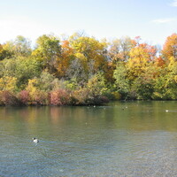 - en-CA Fall colours on the trees at Dufferin Islands. Ducks and gulls are visible in the background.