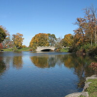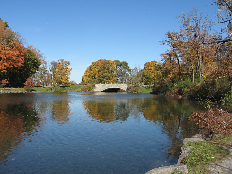 - en-CA Fall colours on the trees at Dufferin Islands. The Niagara Parkway bridge is visible in the background.
