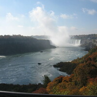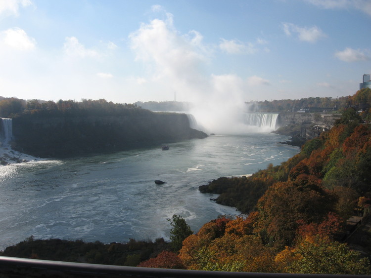 - en-CA Fall colours on the Canadian side of the gorge with the Horseshoe Falls in the background. The Maid of the Mist can also be seen in the Lower Niagara River.