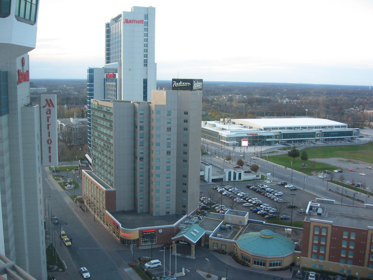 - en-CA View from the 23rd floor of the Embassy Suites Hotel. Marriott Niagara Falls Hotel Fallsview and Spa, Marriott gateway on the Falls Hotel, Radisson Hotel and Suites, Tony Roma's Restaurant and the Scotiabank Convention centre are all visible.