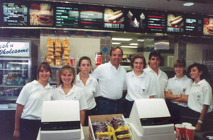 en-CA Roger Woodward with family returns to Niagara Falls on the 30th anniversary of his plunge over the Horseshoe falls. Roger with the staff of fast food restaurant at Table Rock House.