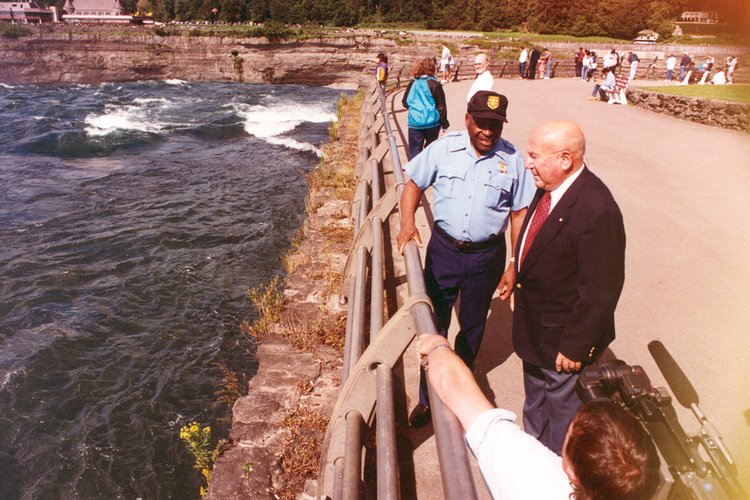 - en-CA Left to right: John Quattrochi and John Haynes standing near the spot on Terrapin Point from which they helped rescue Deanne Woodward from going over the Horseshoe Falls on July 9, 1960 .