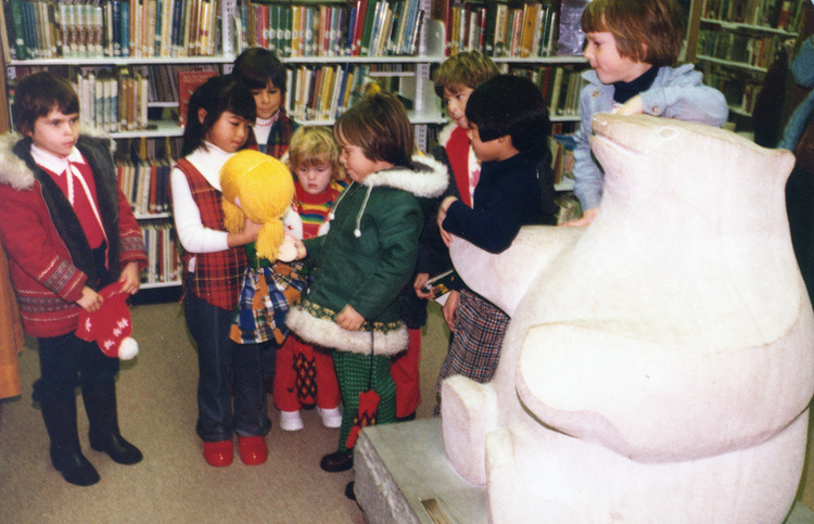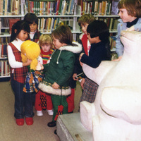 - en-CA Inside card: A fairy tale puppet is admired by children at the Victoria Avenue Library. "Listening in" is the big bear, the E.B. Cox sculpture in the Boy's and Girl's Department.