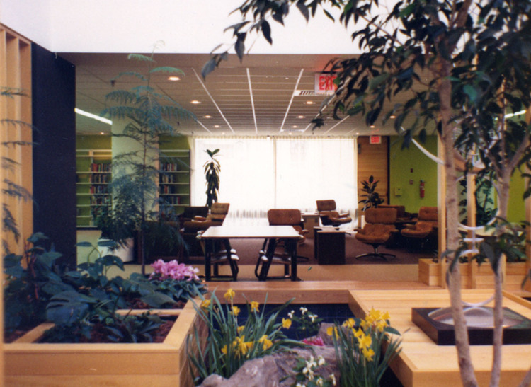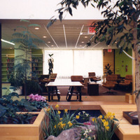 - en-CA Fountain and seating area of the new library building at 4848 Victoria Avenue