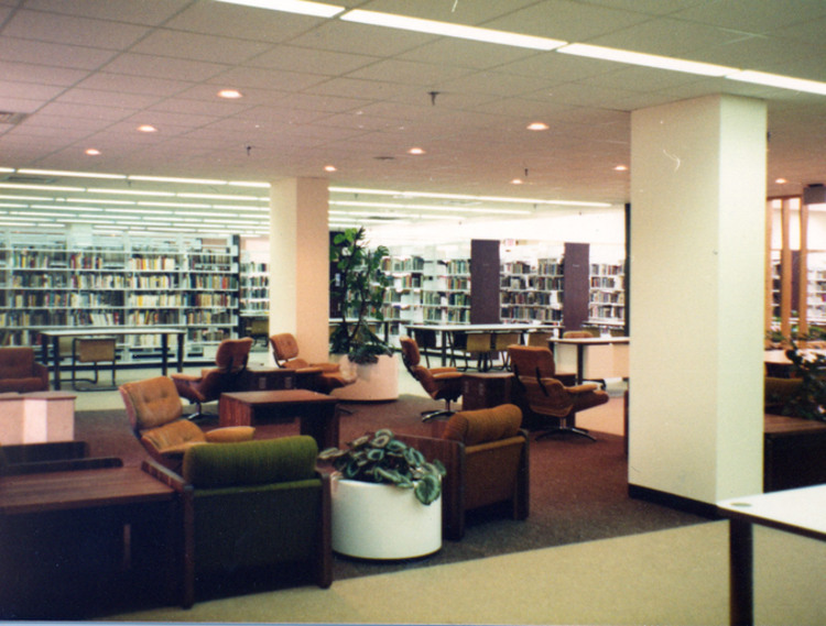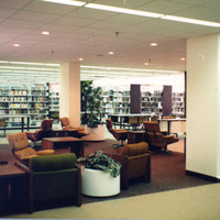 - en-CA Seating area and tables in the new library building at 4848 Victoria Avenue