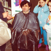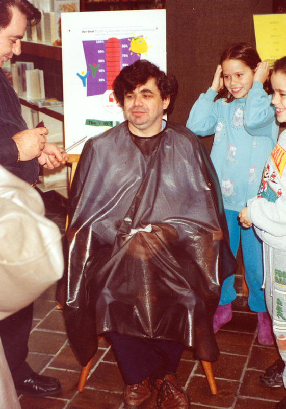 - en-CA Andrew Porteus being shaved for fundraising event for the United Way while his children Heather and Justin look on.