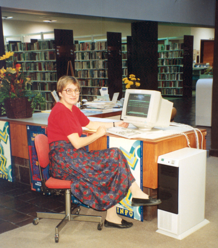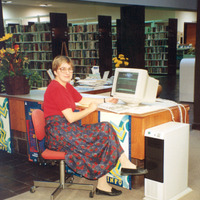 - en-CA kathy Barker at the reference desk demonstrating "Count on Us" program.