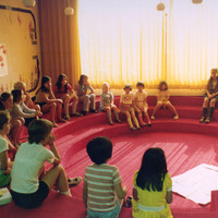 - en-CA Children sitting on steps, listening to a story in the storytime pit in the children's department of the Victoria Avenue Library