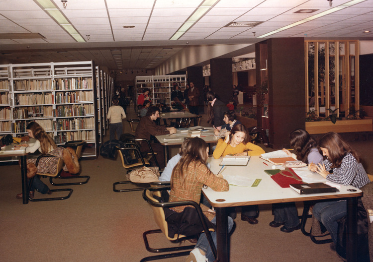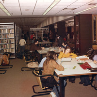 - en-CA People sitting at tables in the non-fiction are of the Victoria Avenue Library