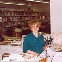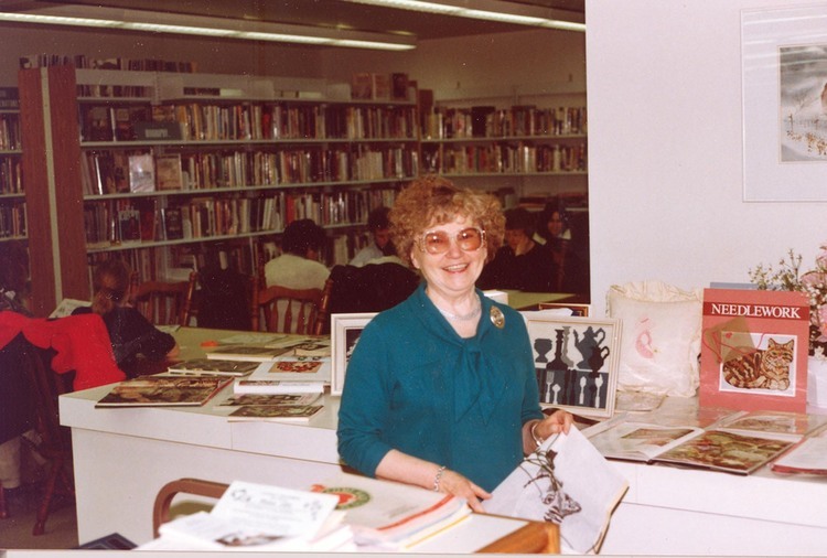 - en-CA Staff member Elizabeth Allen standing by display on needlework in the adult department of the Chippawa Branch Library.