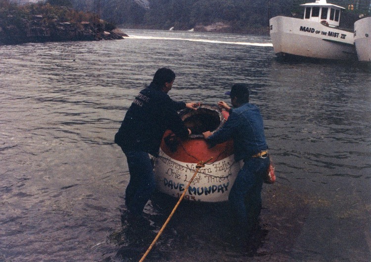 - en-CA On October 5 1985 John "David" Munday became the 10th person to go over the Canadian Horseshoe Falls in a barrel. He attempted the stunt again on September 27 1993 and became the first man to accomplish the feat twice