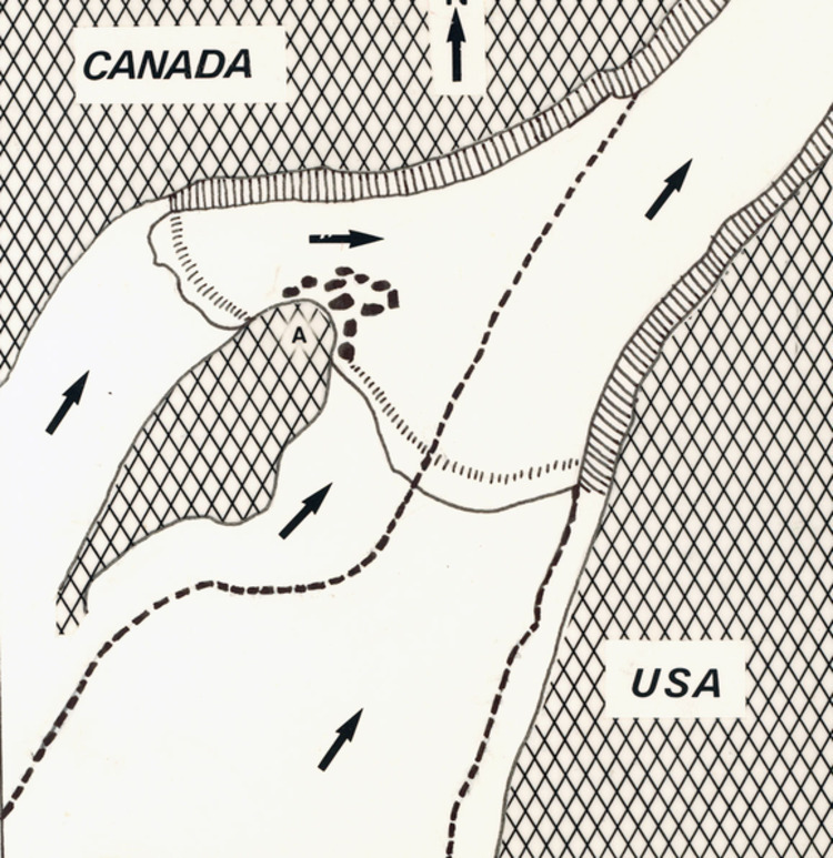 - en-CA This map shows the position of the divided falls when it reached the present Niagara Glen area. The heavy dotted line shows the gorge, formed by the three successive cataracts from three different layers of rock, through which the river flows today. The west falls on the right was to erode back faster than its branch falls, eventually cutting off the flow of water through this channel and drying off the eastern falls. This dried-off river bed is now the Wintergreen Flats picnic area. The American Falls will some day suffer the same fate as befell this western branch falls.