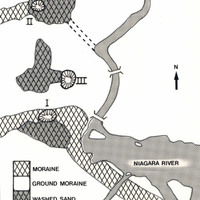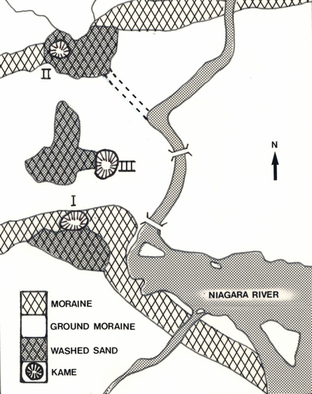 - en-CA No.I Drummond Hill Kane, on Lundy's Lane Ridge which is on the Niagara Falls Moraine, shown by the checkered lines; No.II, Barre Moraine (St. Davids or Ravine Hill sand-pit), Indian Ossuary and edge of the escarpment; No. III, Fairview cemetery, a kame, at the western end of bridge Street in Niagara Falls.