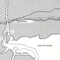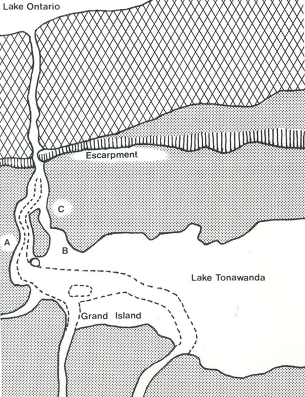 - en-CA This map was drawn from information contained in the United States Geological Survey of 1913. Ancient lake Tonawanda shows as merely an enlarged Niagara River which spilled over the 644 kilometres (400 miles) wscarpment at five main points - Holley, Medina, Gasport, Lockport and Lewiston in present day New York State. The Lewiston outlet prevailed to become the only outlet - the Niagara River