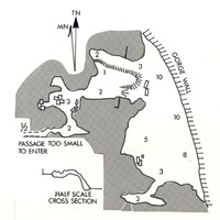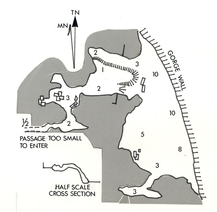 - en-CA Indian cave or Redskin Cave is located 18 metres (60 feet) north of Sunny's cave. It was explored and its measurements were recorded by Scot A. Ensminger and B.R. Horncastle, in 1978. It is a much larger and interesting cave than bender's cave, but it is inaccessble, except by the use of rock climbing rquipment. The entrance is 15 metres (50 feet) wide, 2.5 to 3 metres (8 to 10 feet) high, and 2.1 to 6etres (7 to 20 feet) deep. Near the north side of the entrance, at the top slope, there is a 7.8 metres (26 feet) long crawlway to the west. This leads into a small room, 3 metres (10 feet) in diameter and 0.9 metres (3 feet) high. Two more crawlways lead from this room. One to the west is blocked by breakdowns in 1.5 metres (5 feet). The other, to the south, connects with a small room. A crawlway from this room, to the west, is blocked by dirt in a few feet. The cave contains small stalactites, romstone dams that are 5 centimetres (2 inches) high and flowstone. Near the south side of the entrance is another short crawlway which leads to a small room.
