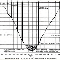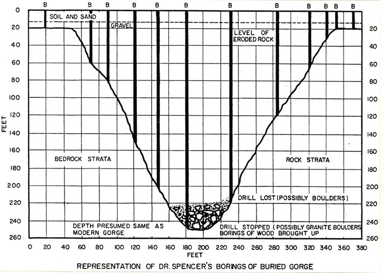 - en-CA This sketch shows the results of Dr. J.W.W. Spencer's borings made in 1906 to ascertain the existence of a buried gorge at the dead end of the Whirlpool. In 1969 geologists George D. Hobson and Jaan Terasme drilled to bedrock to better define the buried channel and to bring up Pleistocene and fossil material for examination. Their results showed: clay 3.6 metres (6 feet); silt, sandy 8.5 metres (28 feet); clay 10 metres (33 feet); silt, sandy 14 metres (47 feet); sandy, gravelly till, 15.8 metres (52 Feet); silt, clayey 17.7 metres (58 feet); sand 21 metres (70 feet); clay 23.8 metres (78 feet); till with sand, gravel and cobbles 28.62 metres (94 feet); gravel and bulders 32.3 metres (106 feet); sand, some silt and clay 42 metres (138 feet); silty sand 44 metres (145 feet); clay with organic matter 45.4 metres (149 feet); sand with twigs and wood 46.6 metres (153 feet); sand, fine and medium 54 metres (178 feet); sand, fine to medium 55.7 metres (183 feet); gravel, cobbles, boulders with layers of glacial till, 84 metres (276 feet); bedrock, 86.8 metres (285 feet)