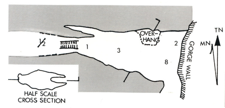 - en-CA Sunny's cave is 4.5 metres (15 feet) north of Bender's Cave. It was surveyed in June 1978 by Scott A. Ensminger and H.E. Krog. The entrance is 3 metres (10 feet) wide and 2.4 metres (8 feet) high. A passage to the west tapers to 0.9 metres (3 feet wide) and 15 centimetres (6 inches) highin 7.6 metres (25 feet).