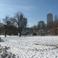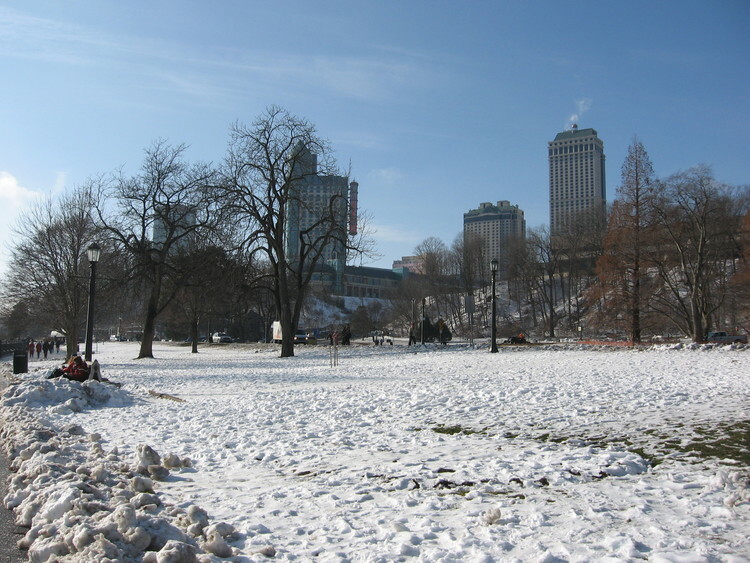 - en-CA Snow on the ground in Queen Victoria Park near Murray Street in winter. The Fallsview casino and Hilton Hotels are visible in the background.
