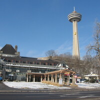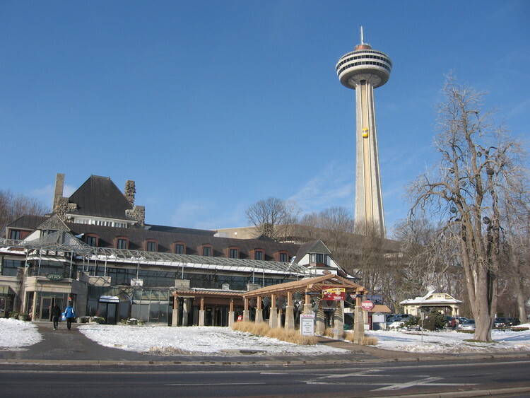 - en-CA Snow on the ground in front of Edgewaters Restaurant, with the Skylon Tower in the background.