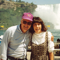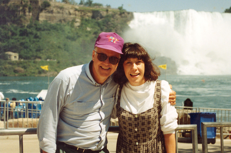 - en-CA George Bailey, on left with comedian Lily Tomlin in front of the American Falls on the Maid of the Mist boat ramp.