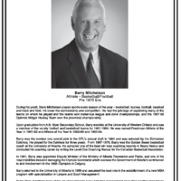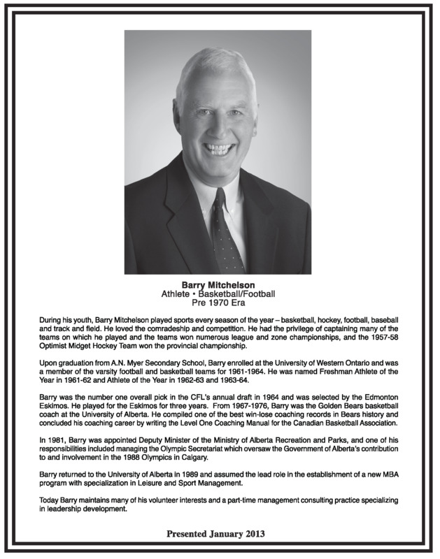 - en-CA During his youth, Barry Mitchelson played sports every season of the year – basketball, hockey, football, baseball and track and field. He loved the comradeship and competition. He had the privilege of captaining many of the teams on which he played and the teams won numerous league and zone championships, and the 1957-58 Optimist Midget Hockey Team won the provincial championship. Upon graduation from A.N. Myer Secondary School, Barry enrolled at the University of Western Ontario and was a member of the varsity football and basketball teams for 1961-1964. He was named Freshman Athlete of the Year in 1961-62 and Athlete of the Year in 1962-63 and 1963-64. Barry was the number one overall pick in the CFL’s annual draft in 1964 and was selected by the Edmonton Eskimos. He played for the Eskimos for three years. From 1967-1976, Barry was the Golden Bears basketball coach at the University of Alberta. He compiled one of the best win-lose coaching records in Bears history and concluded his coaching career by writing the Level One Coaching Manual for the Canadian Basketball Association. In 1981, Barry was appointed Deputy Minister of the Ministry of Alberta Recreation and Parks, and one of his responsibilities included managing the Olympic Secretariat which oversaw the Government of Alberta’s contribution to and involvement in the 1988 Olympics in Calgary. Barry returned to the University of Alberta in 1989 and assumed the lead role in the establishment of a new MBA program with specialization in Leisure and Sport Management. Today Barry maintains many of his volunteer interests and a part-time management consulting practice specializing in leadership development.