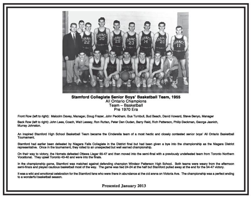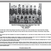- en-CA An inspired Stamford High School Basketball Team became the Cinderella team of a most hectic and closely contested senior boys’ All Ontario Basketball Tournament. Stamford had earlier been defeated by Niagara Falls Collegiate in the District final but had been given a bye into the championship as the Niagara District representative. Once in the tournament, they rolled to an unexpected but well earned championship. On their way to victory, the Hornets defeated Ottawa Lisgar 65- 47 and then moved into the semi-final with a previously undefeated team from Toronto Northern Vocational. They upset Toronto 43- 40 and were into the finals. In the championship game, Stamford was matched against defending champion Windsor Patterson High School. Both teams were weary from the afternoon semi-finals and played cautious basketball most of the way. The game was tied 24-24 at the half but Stamford pulled away at the end for the 54-47 victory. It was a wild and emotional celebration for the Stamford fans who were there in abundance at the old arena on Victoria Ave. The championship was a perfect ending to a wonderful basketball season.