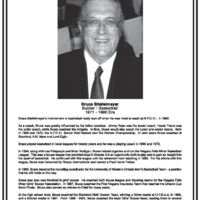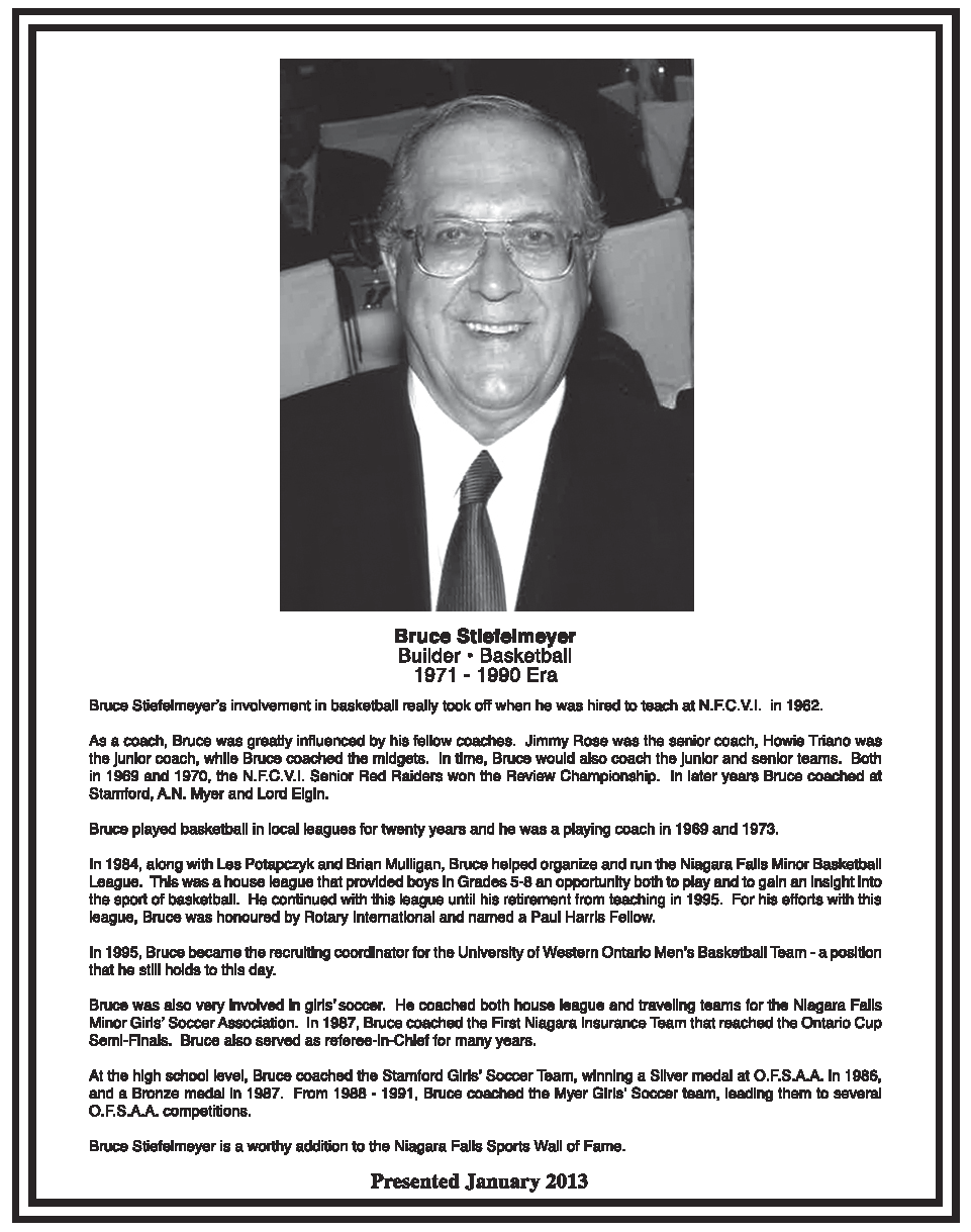 - en-CA Bruce Stiefelmeyer=s involvement in basketball really took off when he was hired to teach at N.F.C.V.I. in 1962. As a coach, Bruce was greatly influenced by his fellow coaches. Jimmy Rose was the senior coach, Howie Triano was the junior coach, while Bruce coached the midgets. In time, Bruce would also coach the junior and senior teams. Both in 1969 & 1970, the N.F.C.V.I. Senior Red Raiders won the Review Championship. In later years Bruce coached at Stamford, A.N. Myer and Lord Elgin. Bruce played basketball in local leagues for twenty years and he was a playing coach in 1969 and 1973. In 1984, along with Les Potapczyk and Brian Mulligan, Bruce helped organize and run the Niagara Falls Minor Basketball League. This was a house league that provided boys in Grades 5-8 an opportunity both to play and to gain an insight into the sport of basketball. He continued with this league until his retirement from teaching in 1995. For his efforts with this league, Bruce was honoured by Rotary International and named a Paul Harris Fellow. In 1995, Bruce became the recruiting coordinator for the University of Western Ontario Men=s Basketball Team - a position that he still holds to this day. Bruce was also very involved in girls= soccer. He coached both house league & traveling team for the Niagara Falls Minor Girls= Soccer Association. In 1987, Bruce coached the First Niagara Insurance Team that reached the Ontario Cup Semi-Finals. Bruce also served as referee-in-Chief for many years. At the high school level, Bruce Coached the Stamford Girls= Soccer Team, winning a Silver medal at O.F.S.A.A. in 1986, & a Bronze medal in 1987. From 1988 - 1991, Bruce coached the Myer Girls= Soccer team, leading them to several O.F.S.A.A. competitions. Bruce Stiefelmeyer is a worthy addition to the Niagara Falls Sports Wall of Fame.