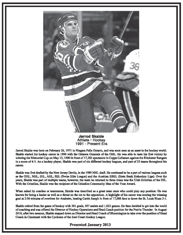 - en-CA Jarrod Skalde was born on February 26, 1971 in Niagara Falls Ontario, and was soon seen as an asset in the hockey world. Skalde started his hockey career in 1990 with the Oshawa Generals of the OHL. He was able to taste his first victory by winning the Memorial Cup on May 13, 1990 in front of 17,383 spectators in Copps Coliseum against the Kitchener Rangers in a score of 4-3. As a hockey player, Skalde was part of six different hockey leagues, and part of 25 teams throughout his career. Skalde was first drafted by the New Jersey Devils, in the 1989 NHL draft. He continued to be a part of various leagues such as the OHL, NHL, IHL, AHL, SEL (Swiss Elite League) and the Austrian EBEL (Erste Bank Eishockey Liga). Over the years, Skalde was part of multiple teams, however, the team he returned to three times was the Utah Grizzlies of the IHL. With the Grizzlies, Skalde was the recipient of the Grizzlies Community Man of the Year Award. When asked by coaches or teammates, Skalde was described as a great team mate who could play any position. He was known for being a leader as well as a threat on the ice to the opposition. A highlight of his career was the winning goal scored in 2:56 minutes of overtime for Anaheim, beating Curtis Joseph in front of 17,000 fans to down the St. Louis Blues 2-1. Skalde retired from the game of hockey with 301 goals, 507 assists and 1,023 games. He then decided to get into the world of coaching and was offered the Director of Hockey Operations and Head Coach position for the Prairie Thunder. In August 2010, after two seasons, Skalde stepped down as Director and Head Coach of Bloomington to take over the position of Head Coach in Cincinnati with the Cyclones of the East Coast Hockey League.