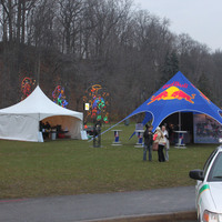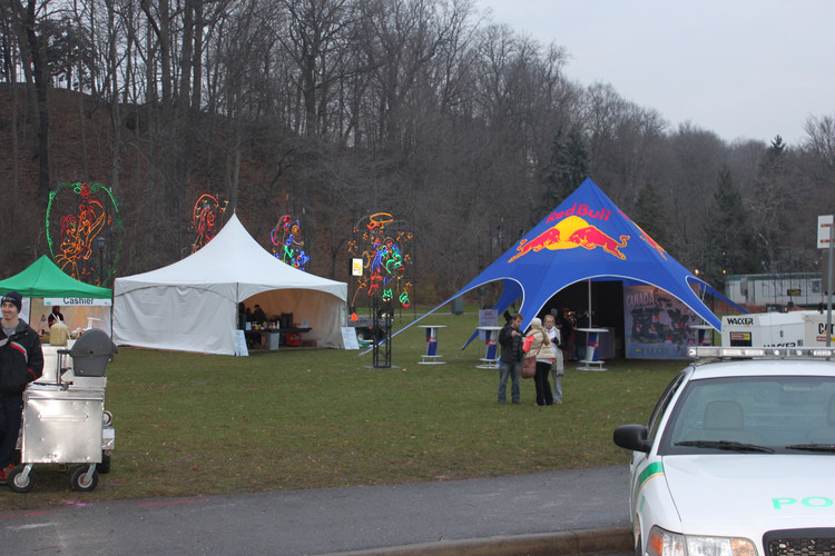 - en-CA Food and beverage tents at the Red Bull Crashed Ice Event near the corner of River Road and Murray Street (Murray Hill). Winter Festival of Lights displays are visible in the background.