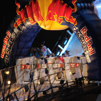 - en-CA Competitors in the starting gate of the Red Bull Crashed Ice course.