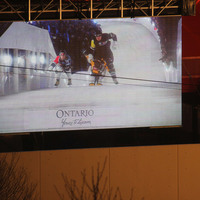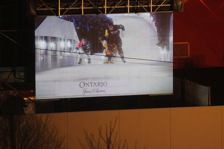 - en-CA Jumbotron showing the Red Bull Crashed Ice competitors.