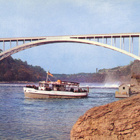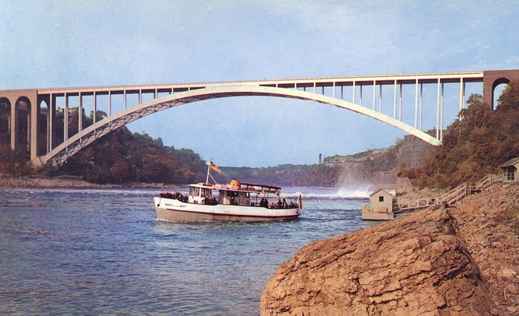 - en-CA The Maid of the Mist steamer by the Rainbow Bridge.