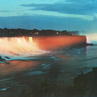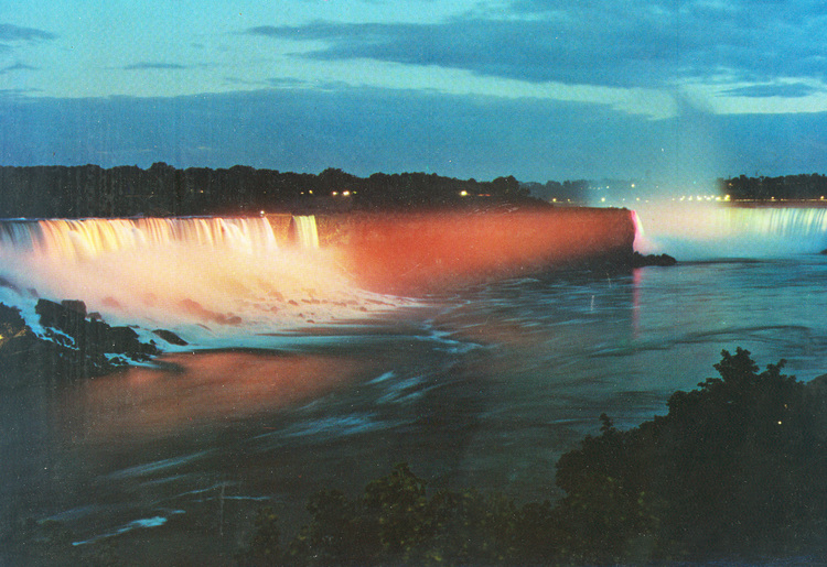 - en-CA The American Falls and the Horseshoe Falls illuminated at night. Taken from Niagara Falls, Canada.