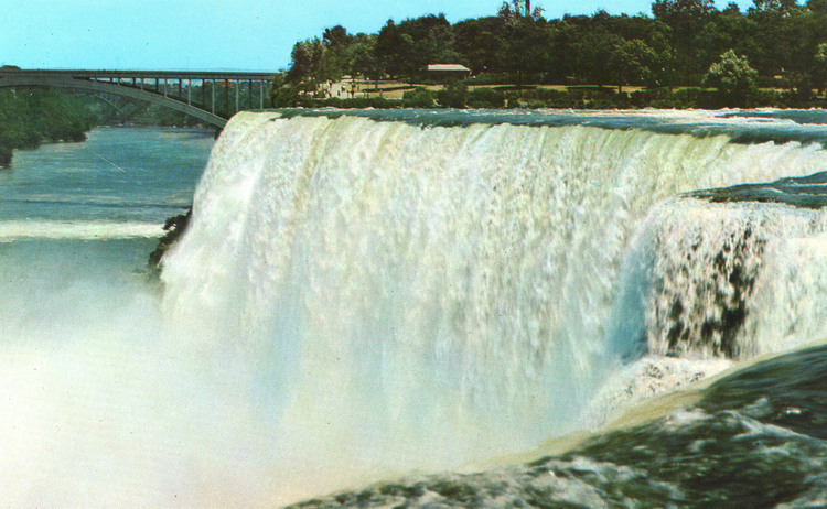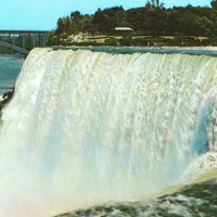 - en-CA This reproduction, photographed from Goat island in the early evening, shows the effects of the rays of the setting sun playing upon the American Falls. The height of the American Falls is 165 feet. It is one of natures amazing formations resulting from millions of years of wearing away of the rock formations by the swift falling water.