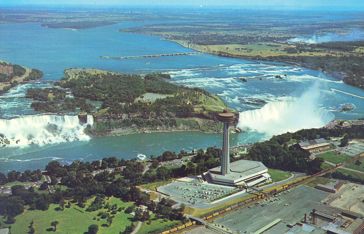 - en-CA Showing the American Falls and Horseshoe Falls, with the Skylon Tower in the foreground taken from Niagara Falls, Canada