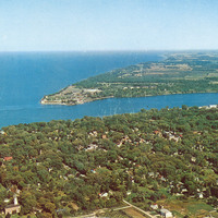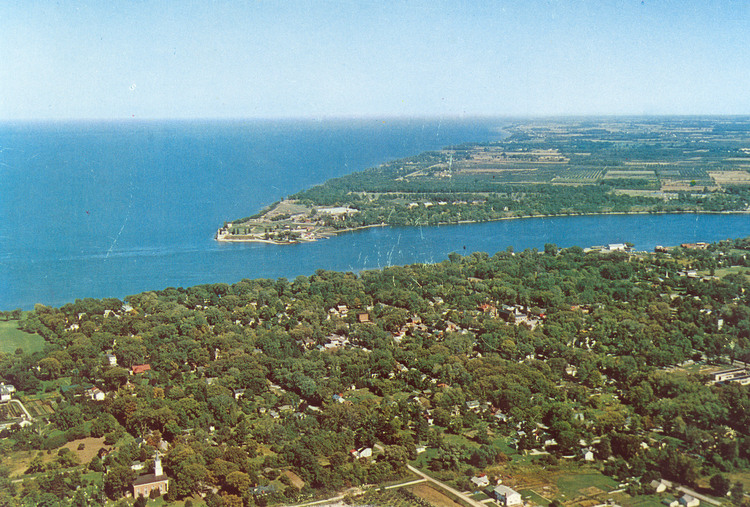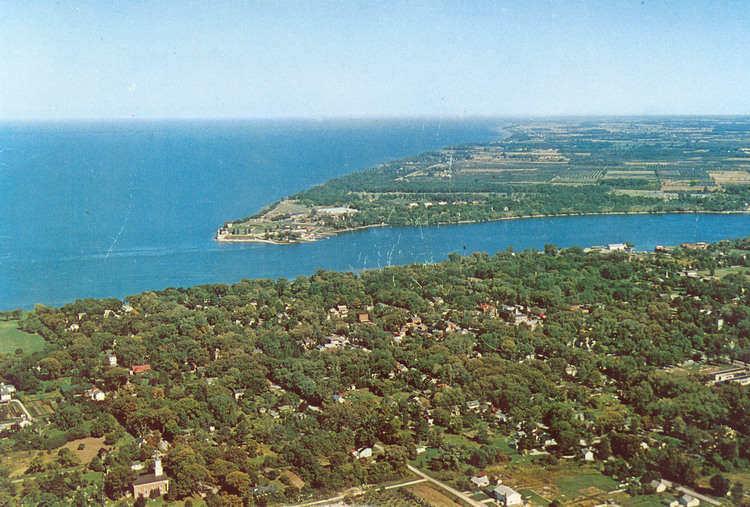 - en-CA Aerial view of the Town of Niagara-on-the Lake, the lower Niagara River and lake Ontario.