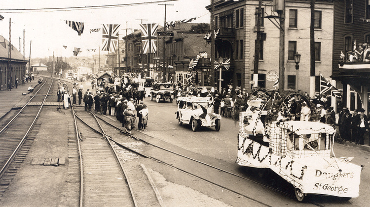 - en-CA Parade on Bridge Street, at the corner of Queen St. and Erie Ave. Annex Cafe and Trennick Hotel can be seen on the right and the CNR station is on the left of picture. Float in front is " Daughters of St. George."