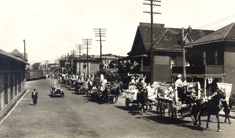 - en-CA Near the corner of Bridge Street and Erie Avenue. Arlington Hotel is on the right and the CNR freight sheds are on the left. The buildings in the distance, which included the Imperial Hotel were demolished to make room for the Niagara Transit garage and Bus Station. The large building seen in the distance is the Trennick Hotel.