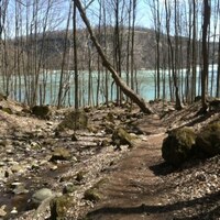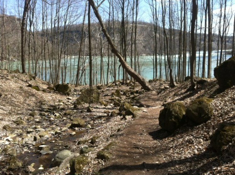 - en-CA Pathway leading through some trees in the Niagara gorge, with the Whirlpool Rapids and the lower Niagara River in the background.