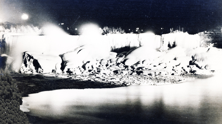 - en-CA The American Falls illuminated at night in the winter time. Photograph is badly ripped in the right hand bottom corner.