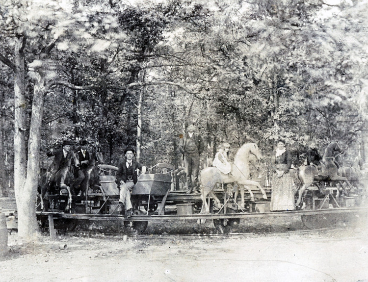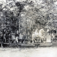 - en-CA Back of photograph reads: Mother and Grandfather Wells carousel at Paradise Grove, Niagar-on-the-Lake, about 1890. The tall man in the centre is Mr. Joseph Wells. The two girls on the horses are Elizabeth and Jamie Lewis. Mrs. Gaby Lewis is standing and the boy on the horse is Gaby Lewis.