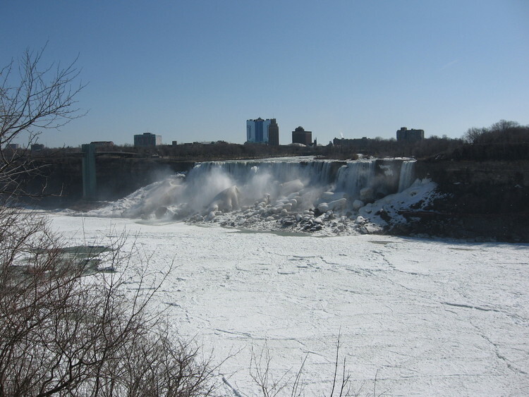 - en-CA Ice in the lower Niagara River and on the rocks at the American Falls.