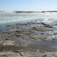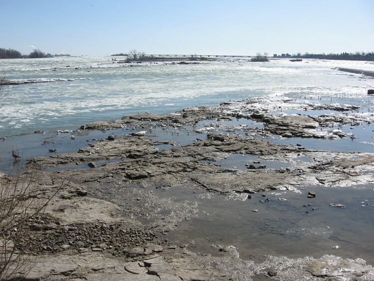 - en-CA Low water conditions above the Horseshoe Falls. The International Control Dam is visible in the background.