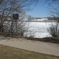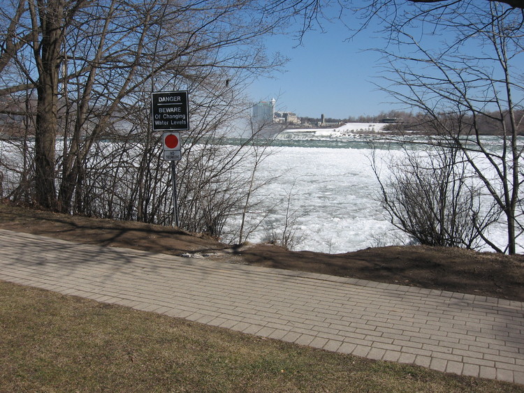 - en-CA Icy conditions in the Upper Niagara River above the Horseshoe Falls. Sign posted on the Niagara River Parkway Recreation Trail reads " DANGER - Beware of changing water levels".