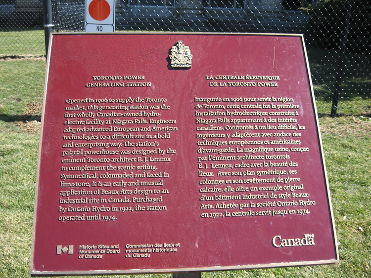 - en-CA Toronto Power Generating Station plaque in front of the building. “Opened in 1906 to supply the Toronto market, this generating station was the first wholly Canadian-owned hydro-electric facility at Niagara Falls. Engineers adapted advanced European and American technologies to a difficult site in a bold and enterprising way. The station's palatial powerhouse was designed by the eminent Toronto architect E.J. Lennox to complement the scenic setting. Symmetrical, colonnaded and faced in limestone, it is an early and unusual application of Beaux-Arts design to an industrial site in Canada. Purchased by Ontario Hydro in 1922, the station operated until 1974.”